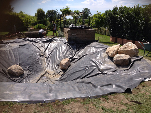 Passeremo a questo punto alla posa di un telo imputrescibile sul fondo e della successiva messa in opera del telo impermeabilizzante in epdm. È questo il momento di definire insieme il posizionamento di eventuali rocce naturali sia interne che esterne alla piscina.